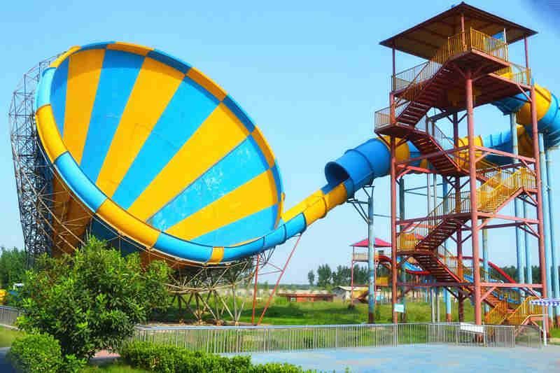 大喇叭滑梯:大喇叭滑梯是根據動能原理,游玩者在鋼平臺上乘坐皮筏從入口件經過水的浮力、沖力以及潤滑作1用下,以較高的勢能獲得速度,冉冉進入黑洞滑道區域,旋即急速下墜,獲得高速,分開黑洞滑道進入大喇叭筒體內,在慣性與重力的作用下,人隨皮筏在大喇叭筒內左右搖擺、跌蕩起伏,最后慢慢滑向出口,進入落水池。游客在滑行過程中,可體驗到高速離心及騰空飄拂之刺激與樂趣。